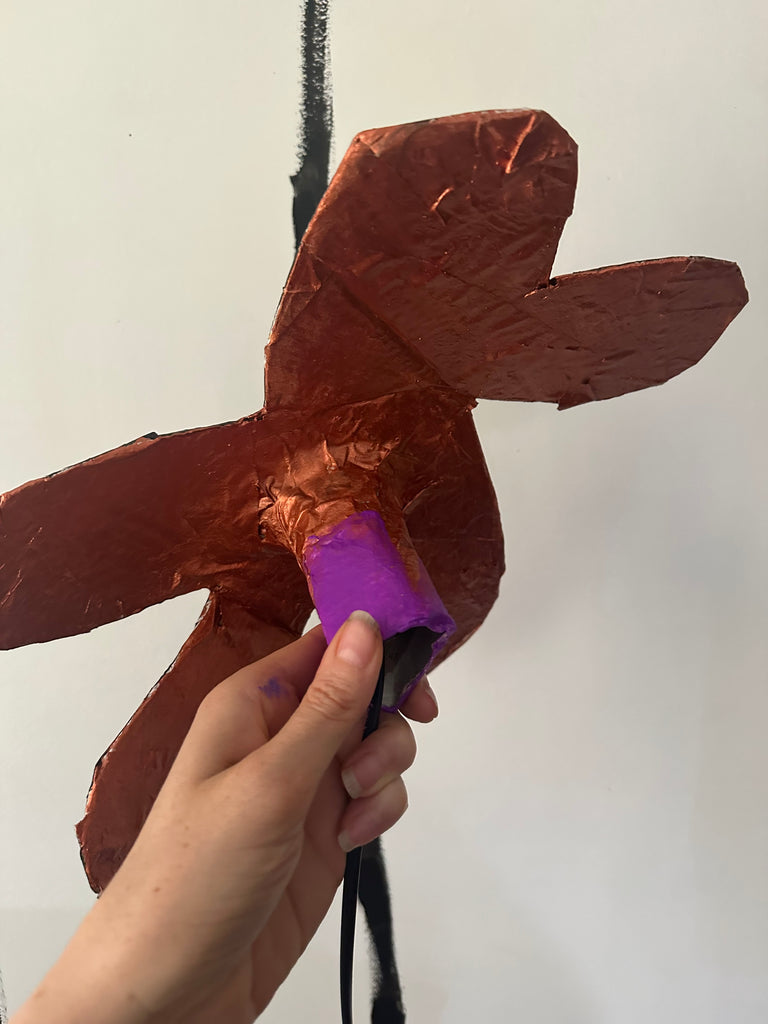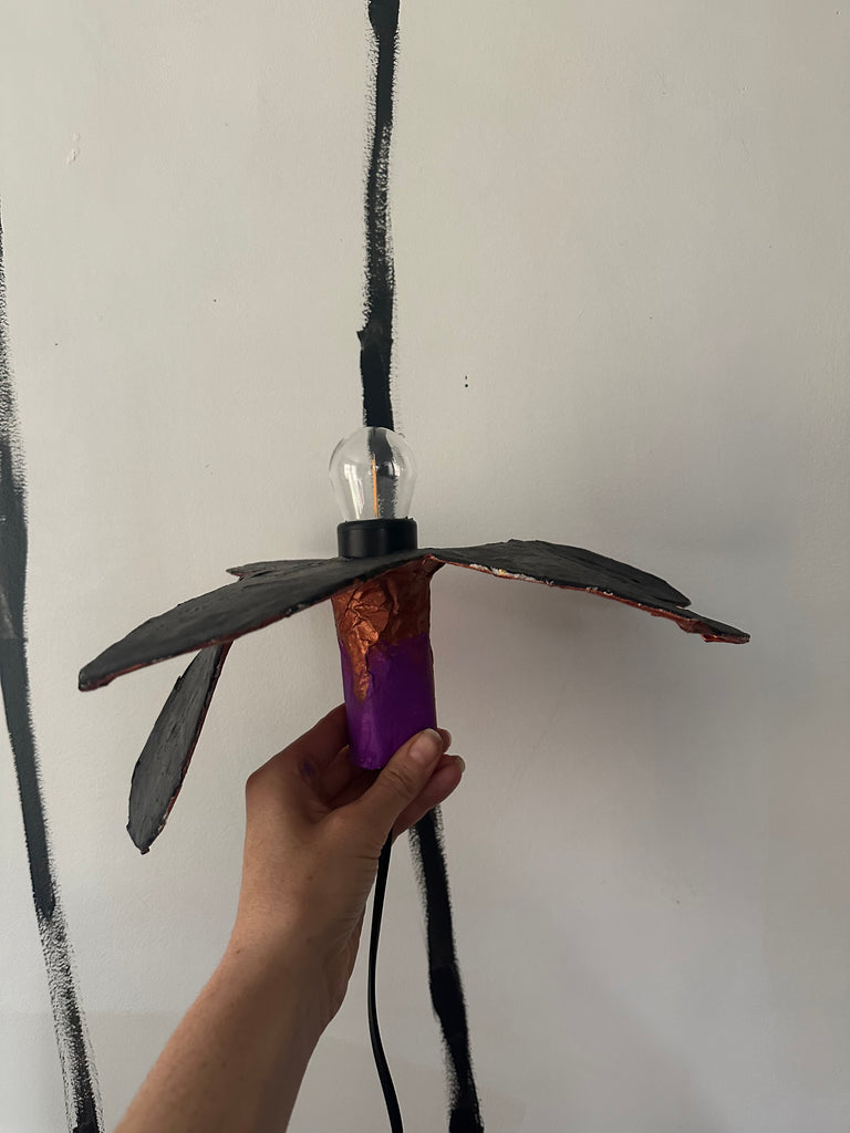 # in the Aronomink Series. One of a kind small black table top flower with mica copper and purple short stem and 6ft long black cord with on/off toggle. Lamp is 15” wide x 11” long.