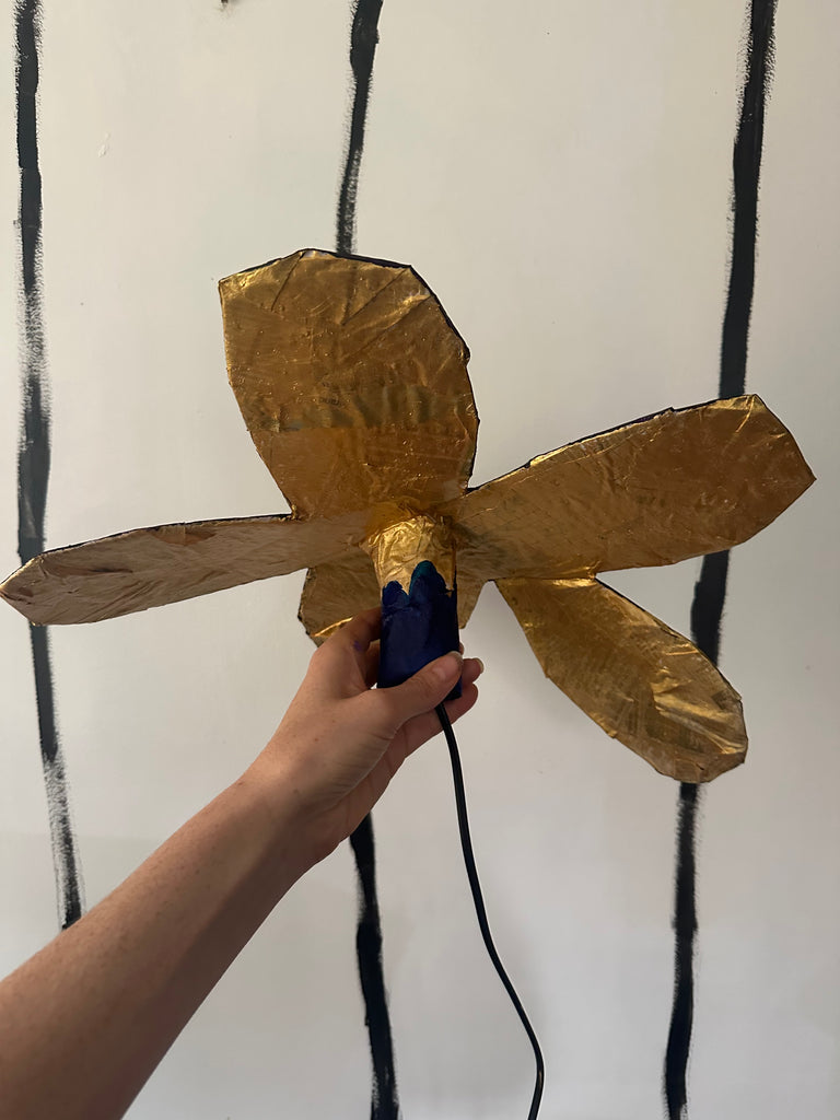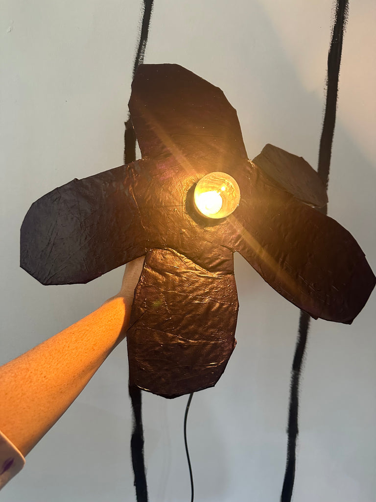 # in the Aronomink Series. One of a kind medium eggplant table top flower with mica gold and blue short stem and 6ft long black cord with on/off toggle. Lamp is 19” wide x 5” long without bulb and 7” long with.