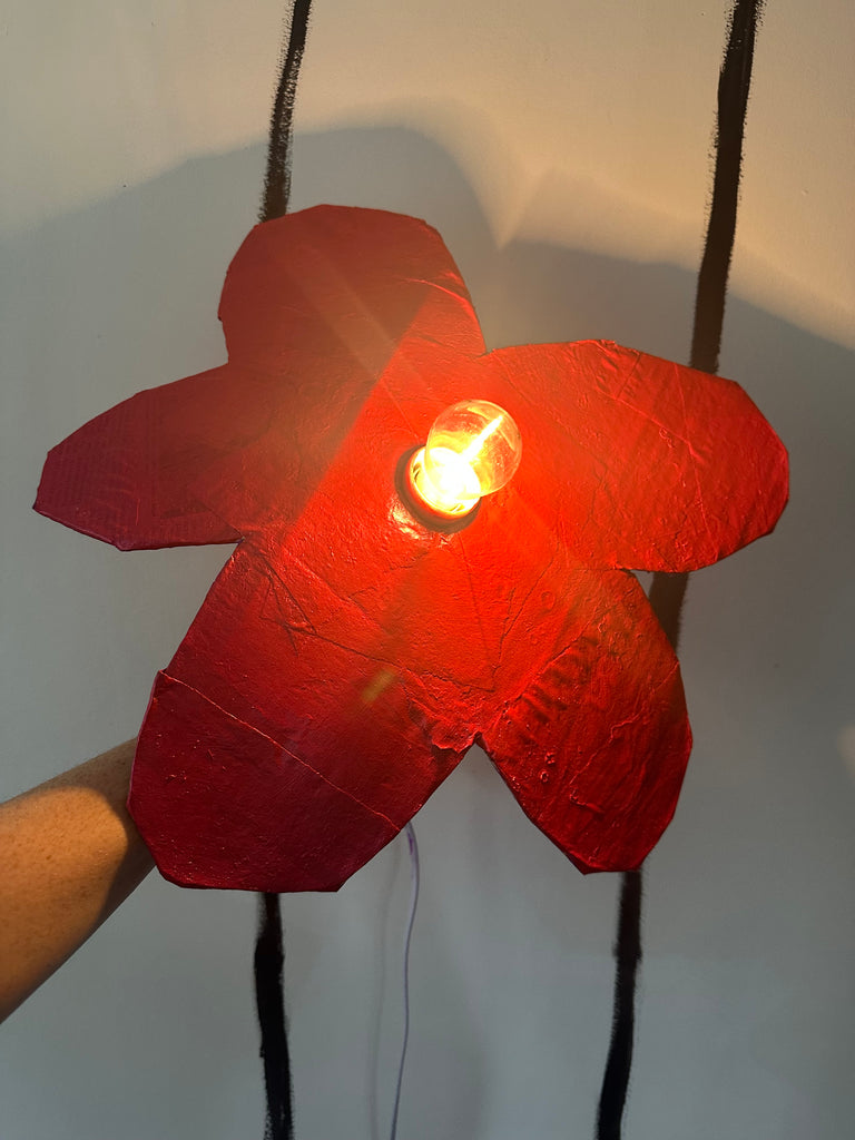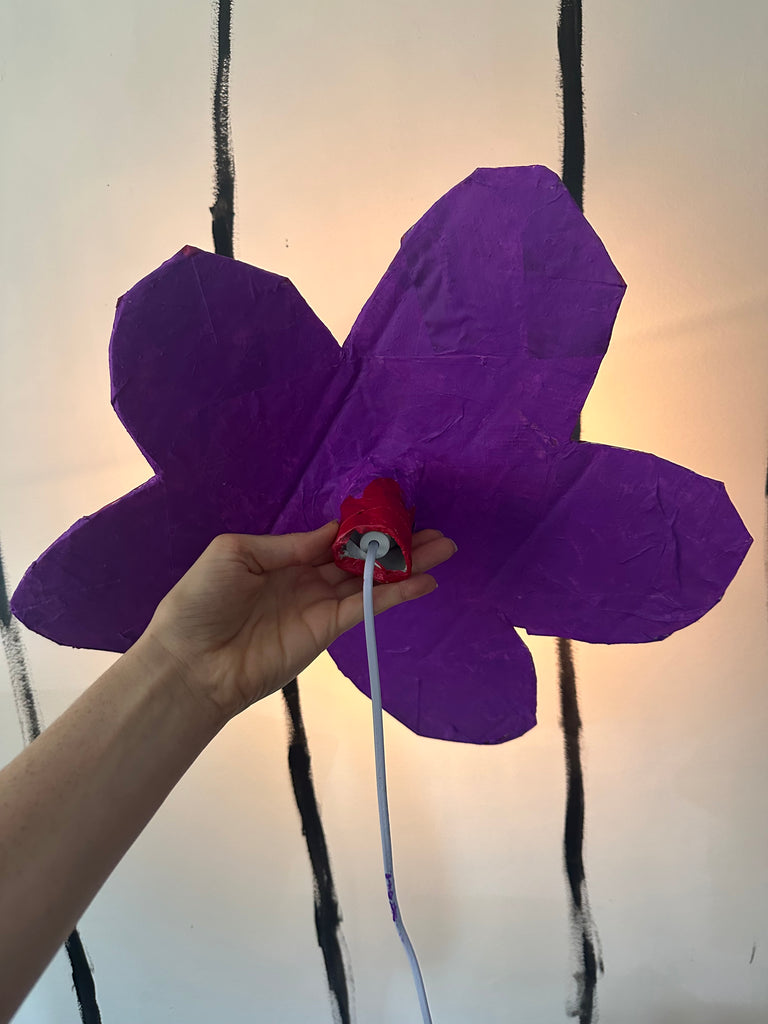 # in the Aronomink Series. One of a kind medium mica red table top flower with purple and mica red short stem and 6ft long white cord with on/off toggle. Lamp is 18” wide x 4” long without bulb 6” long with bulb