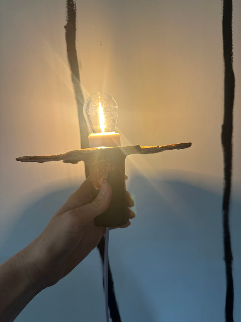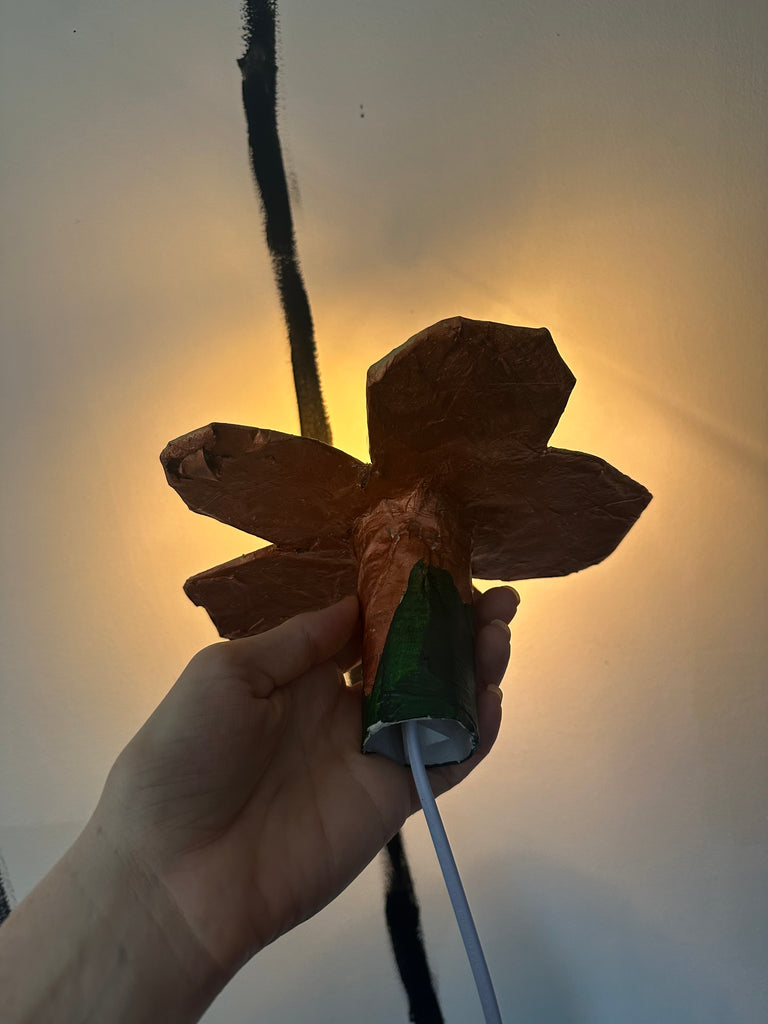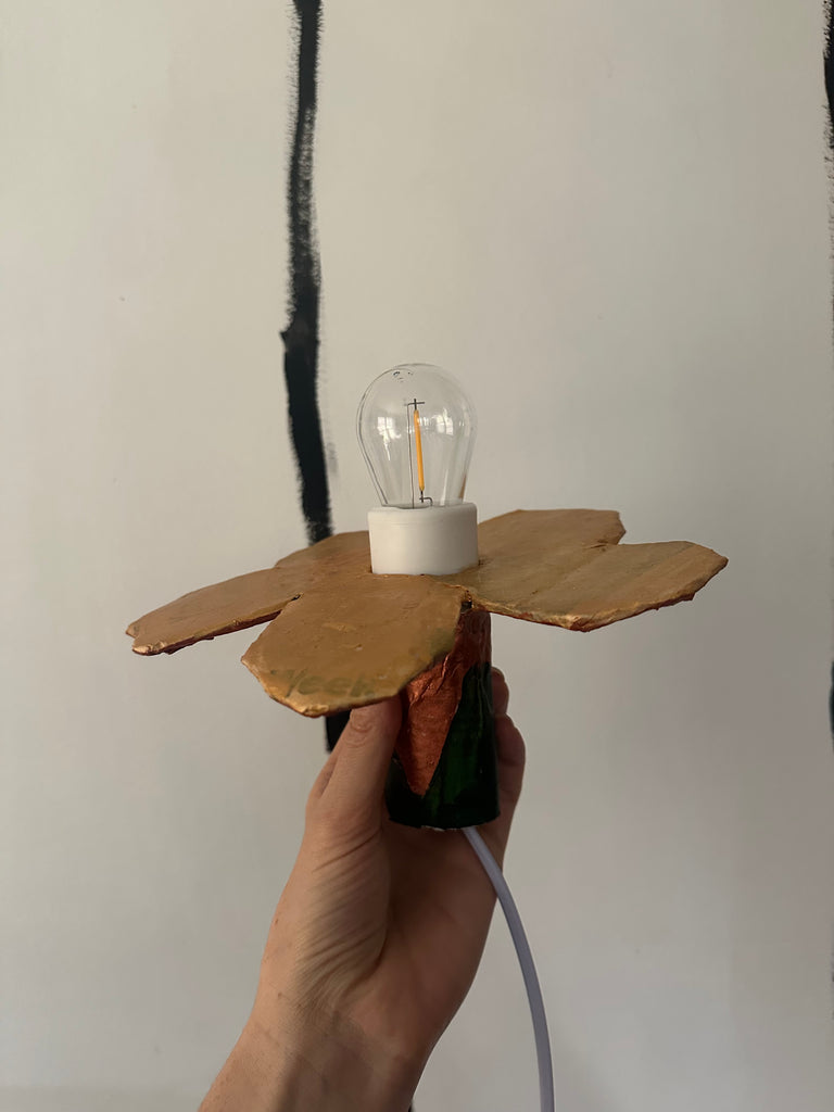 # in the Aronomink Series. One of a kind medium mica extra small gold table top or sconce flower with bronze mica and dark green short stem and 6ft long white cord with on/off toggle. Lamp is 18” wide x 4” long without bulb 6” long with bulb